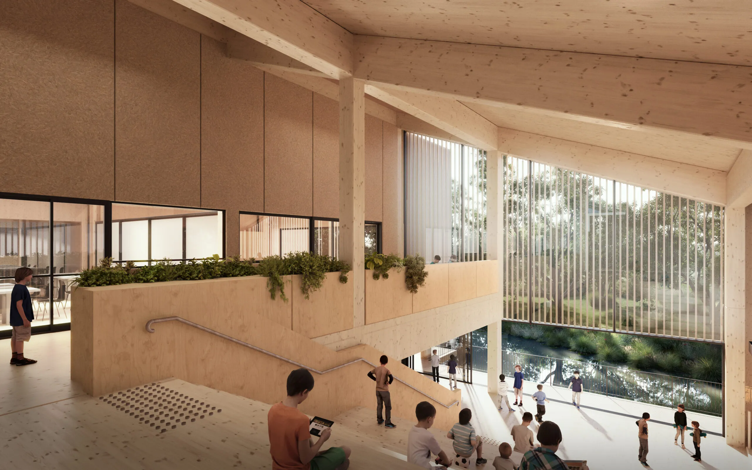 The new Prep School General Learning Unit (GLU) is a two-level building nestled above the dam amongst some larger trees on the site. It will contain eight classrooms with indoor and outdoor breakout spaces, tiered seating, and collaboration rooms across the lower and upper floors. The building design will include a centralised pitched roof with an exposed timber structure, and a façade consisting of timber fins and light glazing
